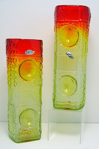 PAIR OF BLENKO AMBERINA VASES: Each with a Blenko Handcraft paper label. West Virginia's pride and joy, a real American treasure. 12 5/8'' tall, a matched pair of blown glass Amberina vases. No chips or cracks.