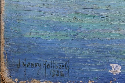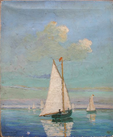 HALLBERG, J. Henry, (American, 20th C): ''Sailboats On Cattegat'', O/C, 24'' x 20'', signed lower left, dated 1938, exhibition title affixed to stretcher verso. Condition - Needs cleaning, several small punctures to canvas and some minor paint loss in the margin lower left, faint evidence of exhibition label affixed lower right. Artist exhibited at the Society of Independent Artist's.