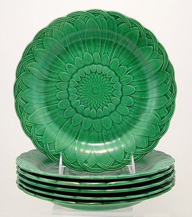 SET OF 6 WEDGEWOOD MAJOLICA SUNFLOWER PLATES: All green majolica glaze, 8 3/4'' dia. Please note one small chip on backside of one. Impressed ''Wedgwood''.