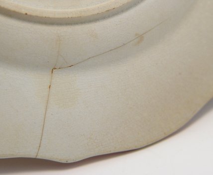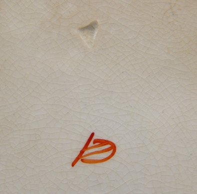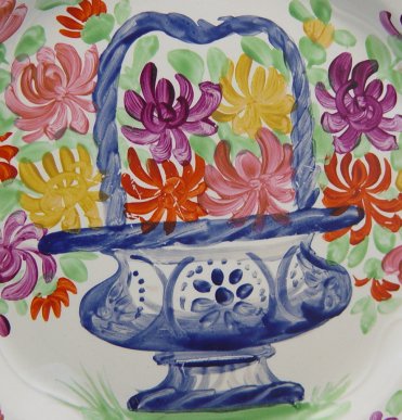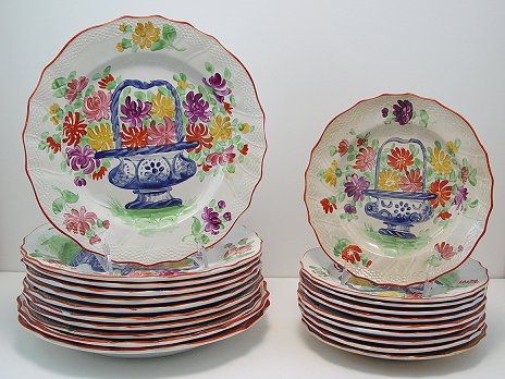 GROUP OF EARLY POLYCHROME PLATES: 20 plates- each with the same hand painted flower filled basket design. Basket weave type border, iron red rim. There are 9 plates, 9 1/2'' dia.(3 with chips), 9 plates, 7 1/2'' dia. and 2 plates, 10 1/2'' dia. Some impressed with a star, some impressed with a triangle, hand painted red mark.
