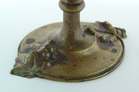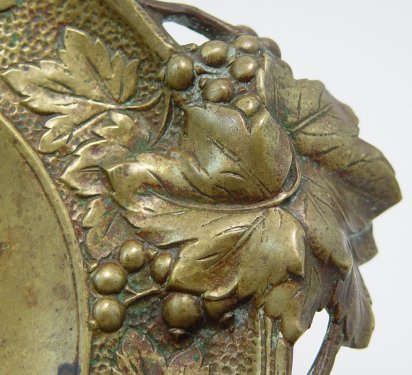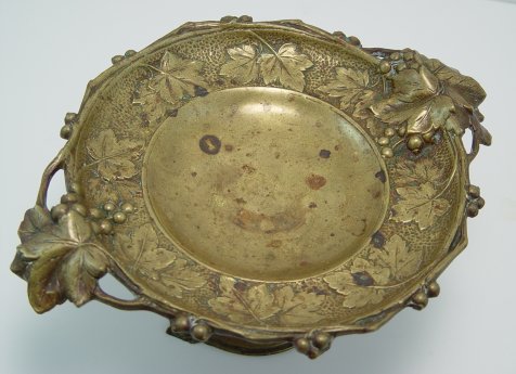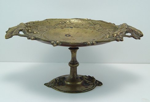 TURN OF THE CENTURY BRONZE TAZZA: Heavily embossed grape and leaf design. Leaf form handles, single pedestal with base also decorated in grapes. 5''h. x 11''.