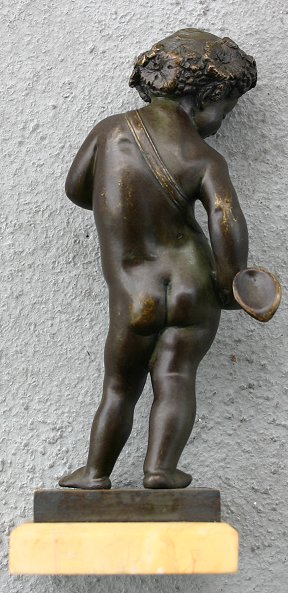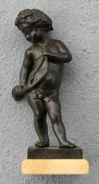 19TH CENTURY NEO-CLASSICAL BRONZE OF A NAKED CHILD WITH HORN: Incised ''Terres'', affixed to a white marble plinth, 7'' height, some wear to patina, scratches verso.