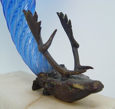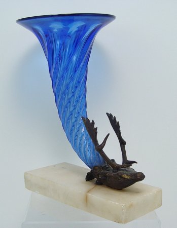 BRONZED DEER HEAD MOUNTED COBALT ART GLASS CORNUCCOPIA VASE: 9''h, the white marble vase is 7'' x 3''.