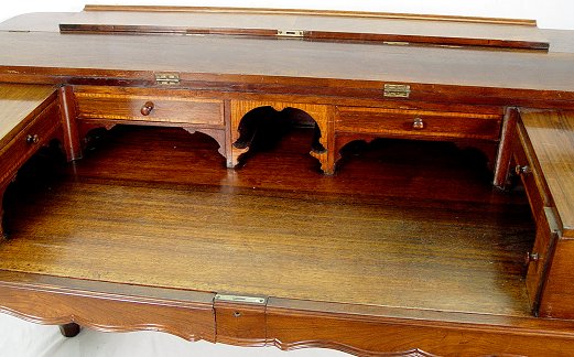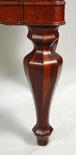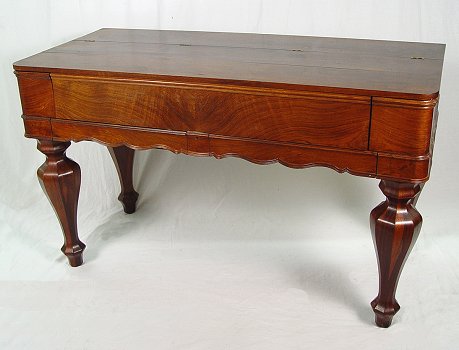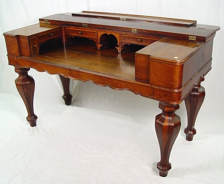 19TH C SPINET DESK: Handsome interior wrapped in banded drawers on three sides. Heavy piano legs. 34''h, x 57'' x 25.5''.