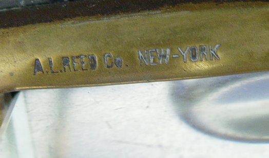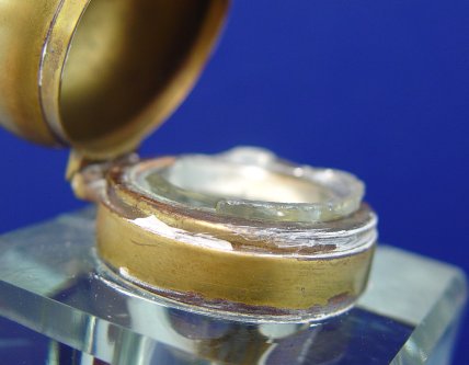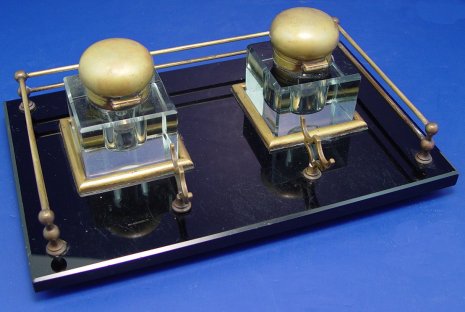 A.L. REED Co NEW YORK BLACK GLASS INK STAND: Double glass ink bottles with well inserts (one chipped) and hinged brass lids, pen rest. Brass trim impressed AL Reed Co. New York. The black glass base is 11'' x 5''.