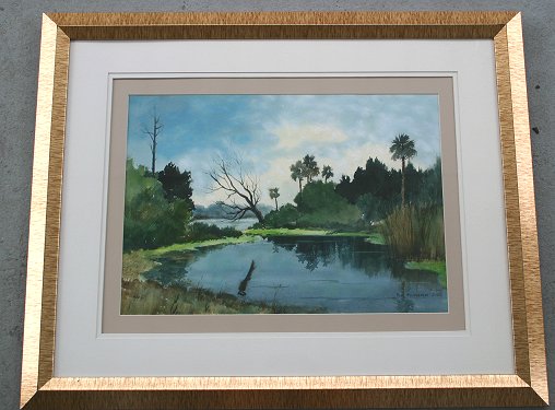 MONTGOMERY, Paul, (American, 20 th C): Florida marsh scene, W/C, sight size 14'' x 20'', signed lower right ''Paul Montgomery, AWS(American Water Color Society), encased in contemporary and worn gilt molding, 25 1/4'' x 35 1/2'' with wear. Condition - Scattered faint spots of staining.