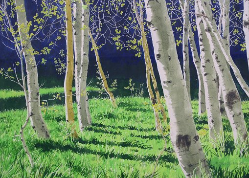 CALDWELL, Will, (American, 20th C): Stand of Aspens, W/C, sight size 16'' x 22 1/2'', signed lower left ''Will Caldwell, Sun Valley '74'', encased in contemporary molding with wear, 29'' x 35''.