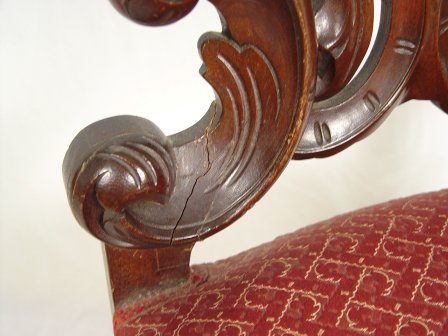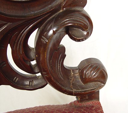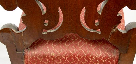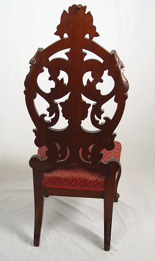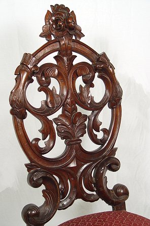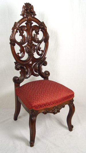 DEEPLY CARVED MAHOGANY SIDE CHAIR: Pierced carved back, note the pair of laughing kings and the detail on the floral crest. 45''h.