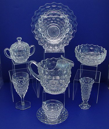 HUGE COLLECTION OF FOSTORIA AMERICAN PATTERN APPROX. 150 PC+: To include square cake pedestal, oval platter, round platter, water pitcher, pair of 2 light candle holders, single candlestick, vase, covered butter, 12'' pedestal bowl, assortment of 22 various bowls and relish dishes, creamer and sugars, 14 salt and peppers, 12 tumblers, 3 1/2'', 12 cocktail stems, 11 plates, 10'' dia, 12 water stems, 12 coasters, 15 cups and saucers, and more.