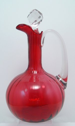 CRANBERRY GLASS DECANTER: Faceted crystal stopper and applied handle on early 20th C cranberry glass decanter. 10''h.