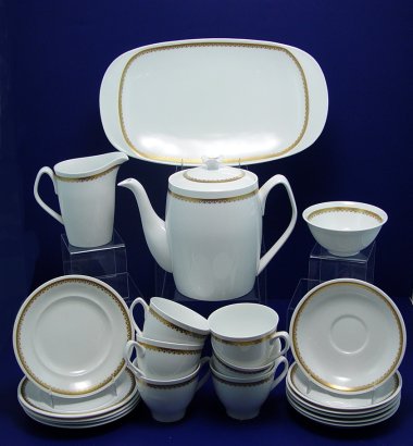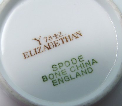 SPODE BONE CHINA DESSERT SET IN THE ELIZABETHAN PATTERN: 15 piece set to include teapot, creamer, open sugar, 6 cups and saucers, 5 cake plates, and a serving platter. Y7842. Est. $300/400**