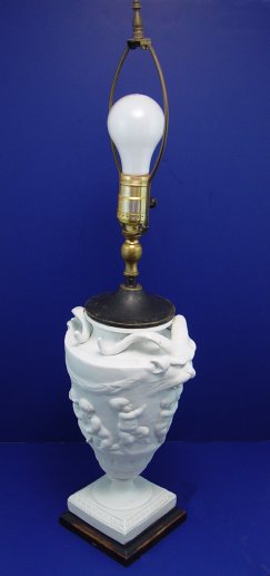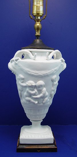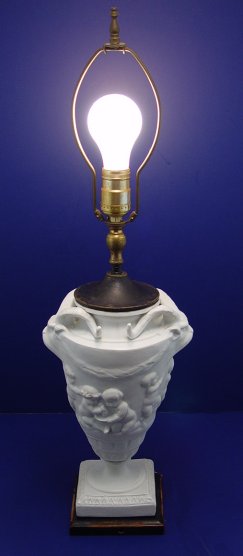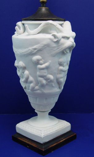PARIAN LAMP: Band of putti guarded over by horned figure masqueron. Porcelain is 11''h. Lamp is approx. 24''h. overall.