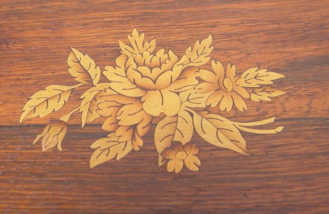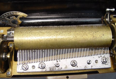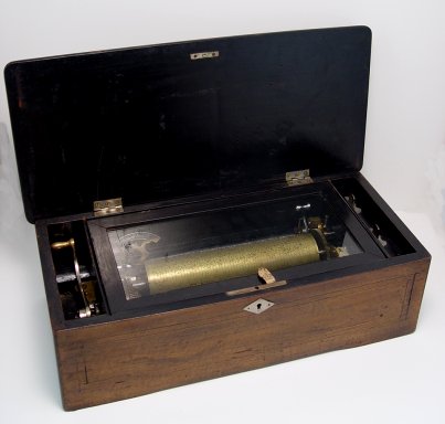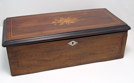 SWISS CYLINDER MUSIC BOX: Plays eight songs, in good working order. The case has marquetry and string inlay. 5 1/2''h. x 17 1/2'' x 7 1/2''.