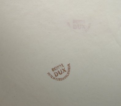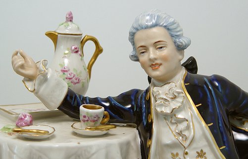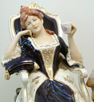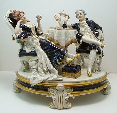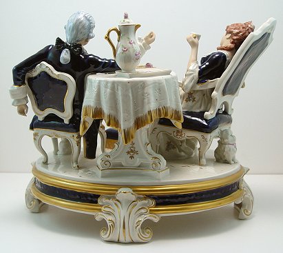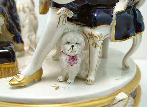 ROYAL DUX PORCELAIN FIGURAL GROUP: Prominent cobalt coloration, rose decorated china, dogs hidden under each chair. Lifelike expressions and body language on the couple casually enjoying each others company. Scrolled and gilt legs. 12 1/4''h. x 15'' x 12''. Both impressed and ink mark ''Made in Czechoslovakia''.