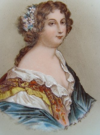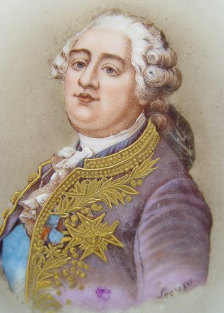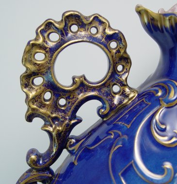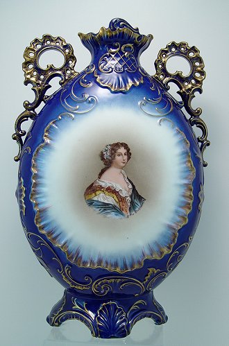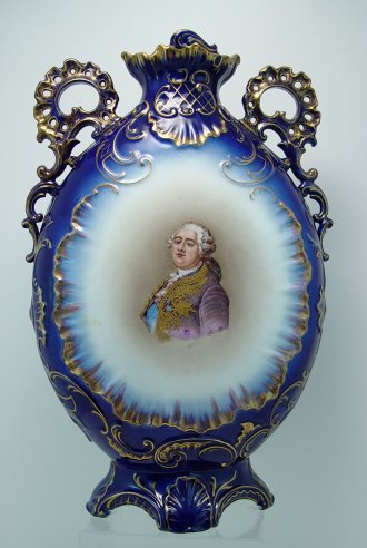 COBALT PORCELAIN LOUIS XVI PORTRAIT VASE: Verso is Mdme de Montpensier. Ornate pierced loop handles, thick gilt enhancement to jacket worn by Louis XVI. 16 1/2''h, 11'' dia. body, 4'' dia. rim.