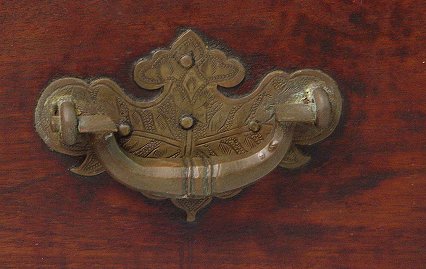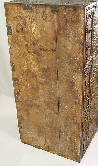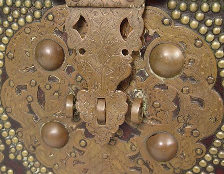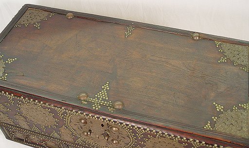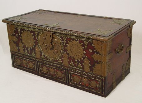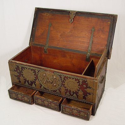 ANTIQUE INDIAN KUWAIT COFFER: Hinged lid trunk covered in elaborate chased brass nailheads and rosette mounts, brass handles. Three drawers across the base. Approx. 20''h, x 43'' x 20''.