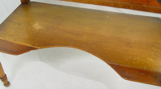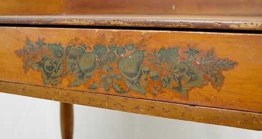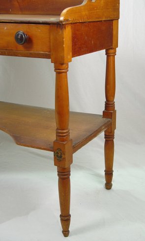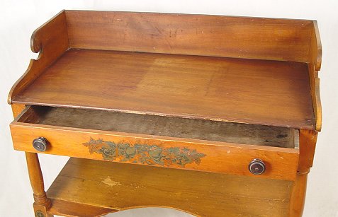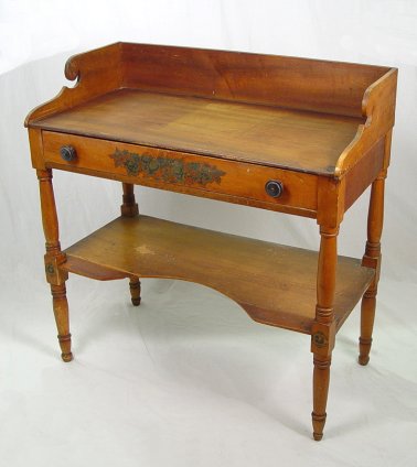 ONE DRAWER WASH STAND: Decal decoration on a full length drawer of dovetail and chamfered construction. High backsplash continues along the sides. Shaped lower tier, turned legs. 34 3/4''h, x 34''w, x 17 1/2''. Please call for condition.