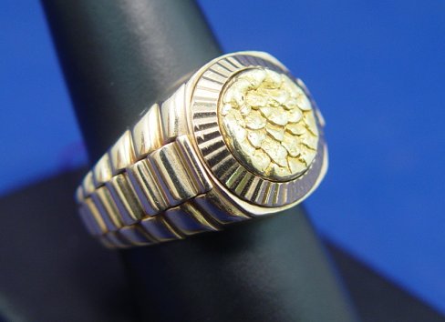 GENTLEMAN'S 14K ROLEX STYLE RING: Impressive ring of 14k yellow gold in the Rolex style, centered by a hammered nugget plate of 22k gold, marked ABL 14k, size 10, approx. 15 grams.