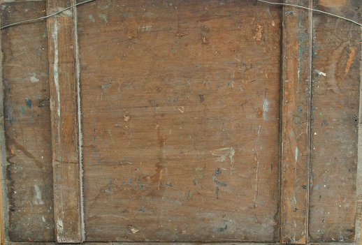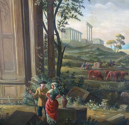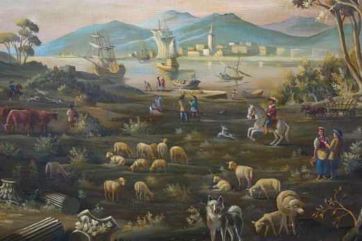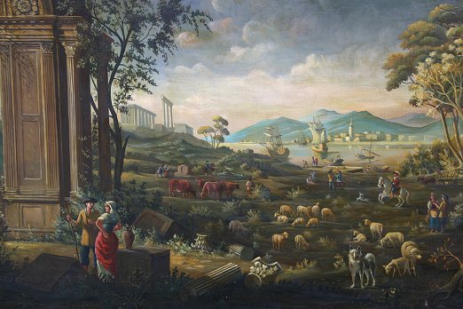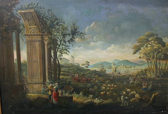 19TH CENTURY O/B ITALIANATE LANDSCAPE WITH FIGURES, ANIMALS AND SHIPS: 29 1/2'' X 42 1/2'', no visible signature, encased in a later worn gilded molding, 33'' x 46''. Condition - In-paint visible upon black light scattered throughout, abrasions, minor paint loss, several dents, needs TLC.