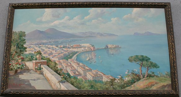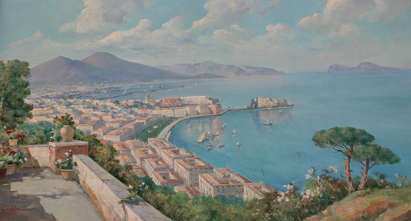 CIAPPA, C., (Italian, 20th C): Bay of Naples panoramic scene, O/C, 24'' x 45'', signed lower left, encased in carved molding with wear, 27 1/2'' x 48 1/2'', Kaufmans' label affixed verso. Condition - Needs cleaning, several areas of minor paint fleck.