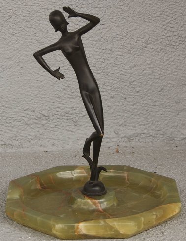 HAGENAUER STYLE DECO FIGURAL ONYX CARD TRAY: Octagonal convex onyx base is affixed to patinated bronze figure, measuring 8 1/2'' height. The onyx is incised ''Made in Austria'' on the bottom. Some minor wear to the patina.