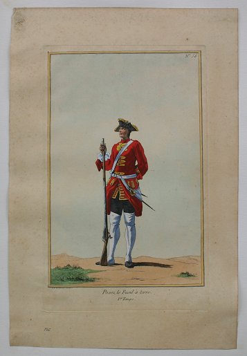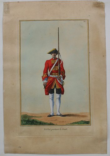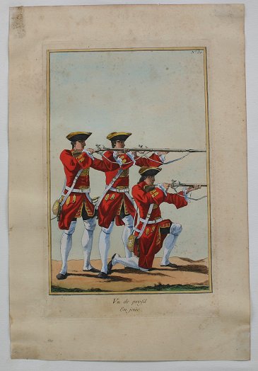 SET OF THREE 19TH C FRENCH HAND COLORED ENGRAVINGS BY BAUDOUIN: All are unframed, sold as a lot. Pedals au Vu de Profil, Posez le Fusil a Terre, Soldat Portant le Fusil, all measure approximately 18 1/2'' x 12''. Condition - They are glued at the corners, some minor staining and scuffing overall, good condition.