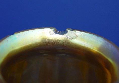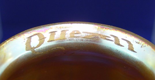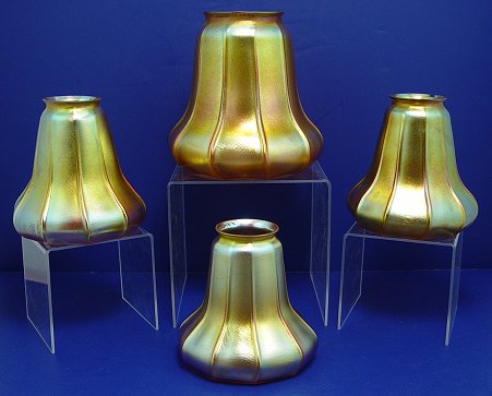 SIGNED SET OF 4 QUEZAL IPRIDIZED GLASS SHADES: Matched set of one large, three smaller. Ribbed design, gold color. Larger shade has a 3 1/8'' rim. The smaller shades have a 2 1/8'' rim. Please note fitter rim on one small shade is chipped. All four are signed.