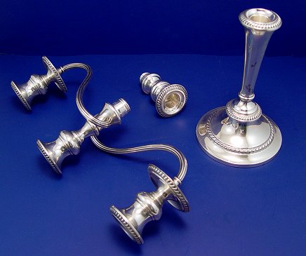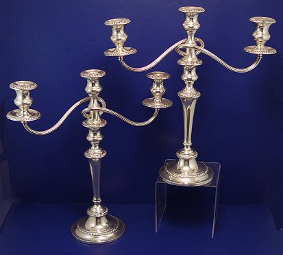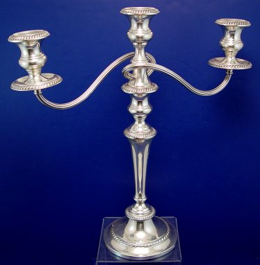 PAIR OF GORHAM STERLING CANDELABRA: 14'' tall, 3 light, curved arm candle holders. Converts to 7 1/2'' or 2'' pairs of single sticks. Weighted and reinforced with rod.