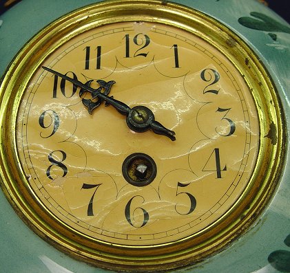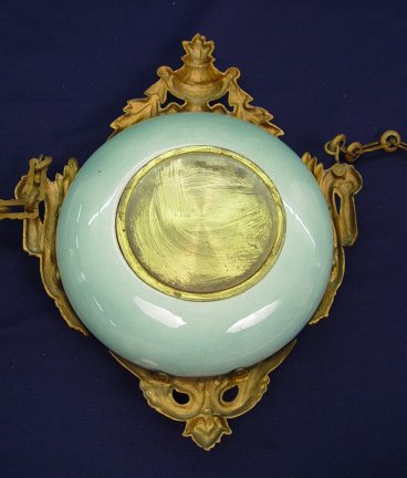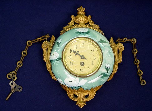 FRENCH HANGING PORCELAIN CARTEL CLOCK ON CHAIN: French movement signed Paris GA France. Gilt metal mountings. The laquered paper dial is 5'' dia, hinged beveled glass front. Diameter of case is 11'', 14''h, overall. Key wind, key included.