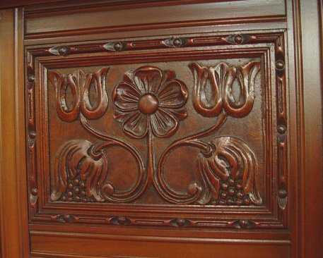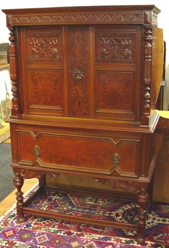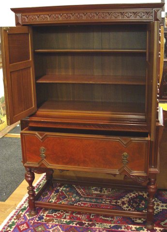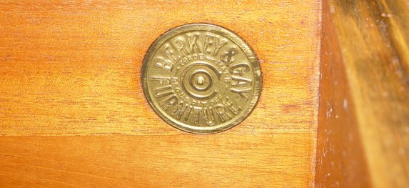 BERKEY & GAY FANCY CARVED BLIND CHINA CABINET: Ca. 1930. Refinished condition. 61''h. x 38 1/2'' x 17 1/2''. Watch for the matching sideboard at lot 12. Berkey & Gay name plate. Also bears the retailers name plate, Revells of Chicago.