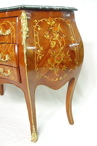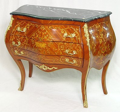 FRENCH MARQUETRY MARBLE TOP BOMBAY CHEST: Black marble over a 3 drawer ormolu mounted chest. Later 20th C. 32''h. x 36''w. x 17''.