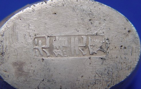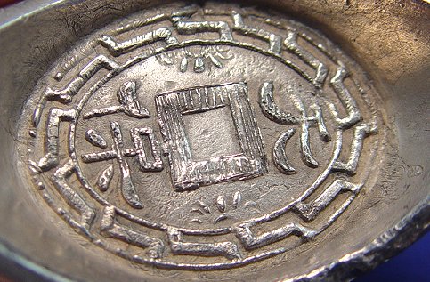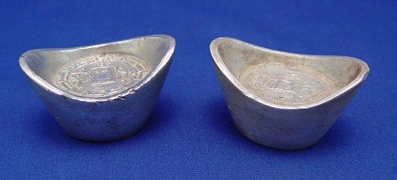 PAIR OF SILVER SYCEE INGOTS - CHINESE TRADING INGOTS: With symbols representing heaven and earth. Approx. 22.44 oz. total. 1 1/2''h., x 4''l.