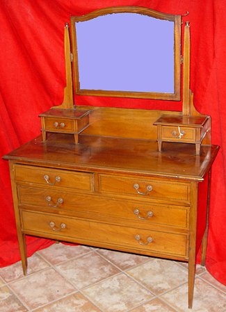 1890'S ENGLISH WALNUT DRESSER WITH MIRROR: Parquetry and string inlay, glove drawers, mirror, 55'' h x 42'' w x 19 1/4'', 4 drawers plus glove drawers.