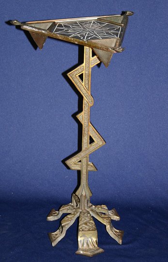 CAST IRON ART DECO SMOKE STAND: Triangular top with original corner insert ashtrays. Dramatically angular base. 21''h. The top is an 11'' triangle.