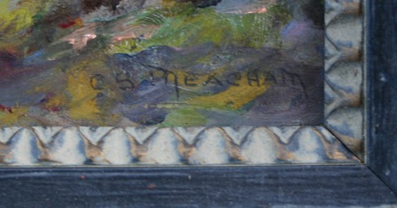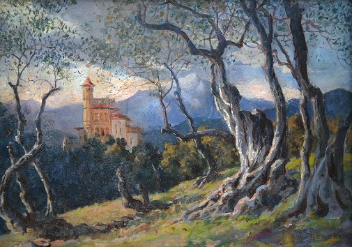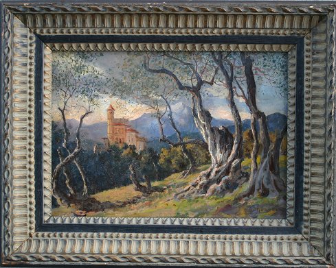 MEACHAM, Charles S., (British, 1900-?): ''Villa Balsi'', O/Champhered Panel, 10'' x 14'', signed lower right, encased in a carved and gilded contemporary molding. Condition - Needs cleaning.