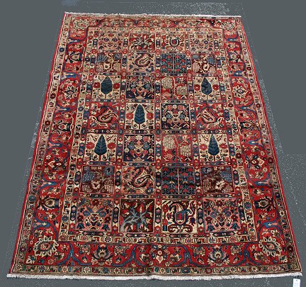 HAND KNOTTED BAKHTYAR CARPET: Approx. 7' x 9'7'', scenic squares, hand knotted in Iran.