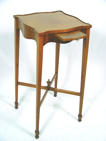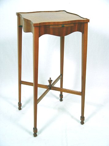HEPPLEWHITE STYLE MAHOGANY STAND: Pull out candle slide, thin tapered legs ending in spade feet. 13 1/2'' x 13 1/2'' x 29''h
