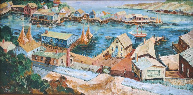 MID 20TH CENTURY DEPICTION OF HENRY GASSER'S PEACEFUL HARBOR: O/Masonite, 24'' x 48'', inscribed verso Original Peaceful Harbor by Henry Gasser, no visible signature; it is unclear whether Gasser painted this piece.