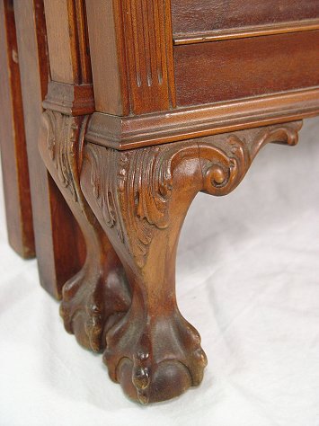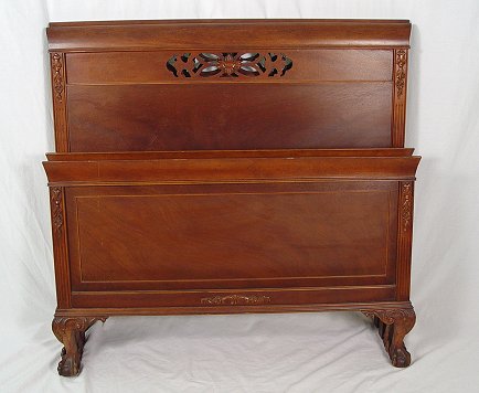 PAIR OF MAHOGANY TWIN BEDS CA. 1940'S: Featuring ball and claw feet on the footboard. Please note the rails do not match the mahogany and not in as good condition as the beds. Headboard is 39''h. foot is 26''h.