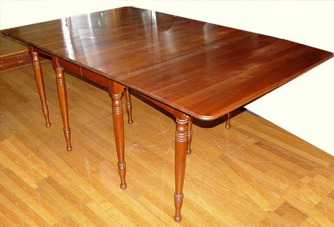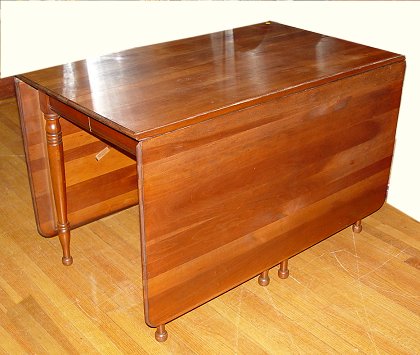 CHERRY DROP LEAF DINING TABLE: Generous 24'' leaves open to extend the table length to 76''. 29''h. x 46'' x 28'' wide with the leaves down. Turned legs. The ends have space for a 20'' wide chair.