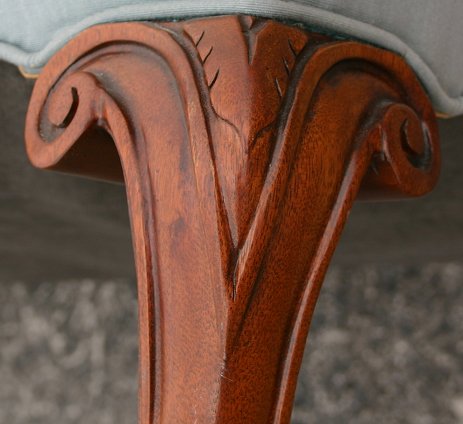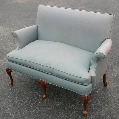 FEDERAL STYLE SETTEE: Tall straight back, rolled arms, mahogany legs with carved knees and pad feet. 38''h., x 53''l.