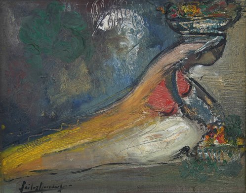 MUKHERJEA, Sailoz, (Indian, 1907-1960): ''Kneeling Peasant Girl'', O/C laid on Masonite, 16'' x 20'', signed lower left, encased in carved custom frame, bears the Workshop Gallery label verso, frame is 23'' x 26 1/2'', shows some minor wear.