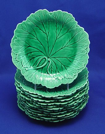 SET OF 12 WEDGEWOOD MAJOLICA LEAF PLATES: Impressed and stamped Wedgwood. 8'' dia.