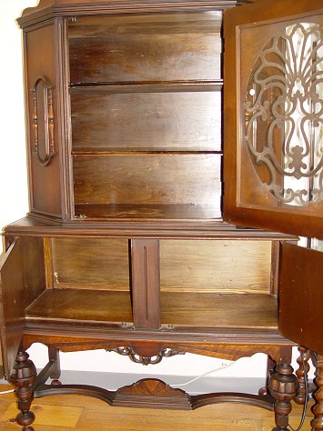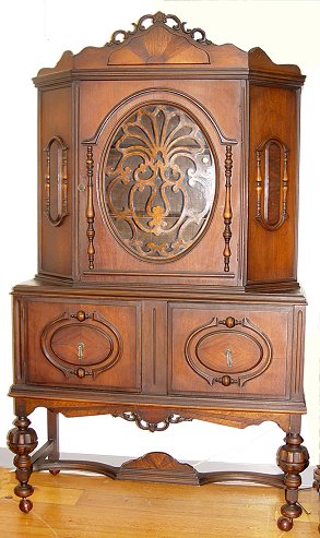 1930's WILLIAM & MARY STYLE CHINA CABINET: American manufactured. Fretwork over the single glass door. Arched crest centers the upper section. Blind cabinet storage under display. Turned stretcher and legs. 78''h. x 45''w. x 15''. Matching server is coming next.