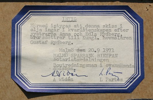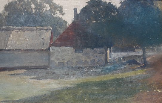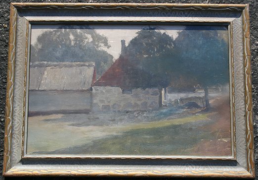 RYDBERG, GUSTAF, (Swedish, 1835-1933): Village landscape study, O/C, unstretched, 12'' x 18'', unsigned, notarized certificate affixed verso, encased in an antiqued carved molding under plexi, molding is worn, measures 15 1/4'' x 21 1/4''.