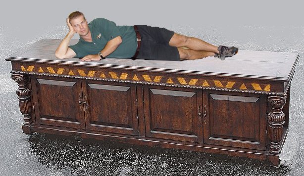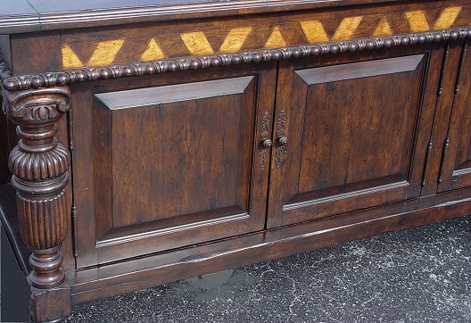 FABULOUS 9' LONG MAHOGANY CUSTOM BUILT SIDEBOARD: Four door cabinet base. Exaggerated gadroon carved edging and carved columnar stiles. 9'l, 34''h, x 28''.