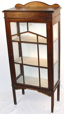 DIMINUTIVE OAK CURIO: English 1920's. Single glass front door, satin lined interior. 47''h. x 23 1/2'' x 11 1/2''.
