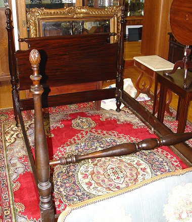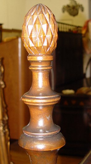 MAHOGANY PINE CONE FINIAL POSTER BED: Full size bed featuring five feet tall head and footboards. Pineapple finials head each post. 54'' wide.