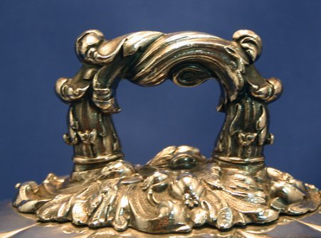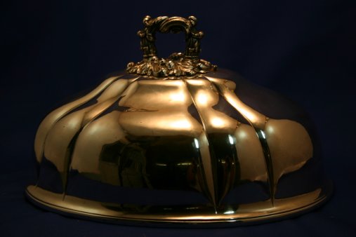 SILVERPLATED DOME: Hallmarked with DS, 14 1/4'' oval. Ornate handle, no dents or monograms.