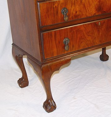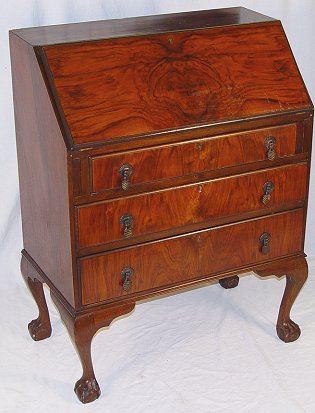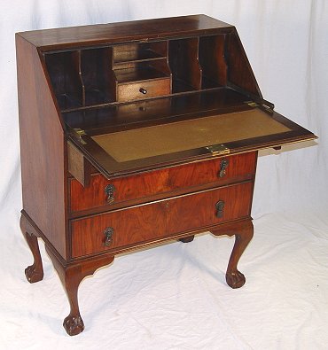 MAHOGANY BALL AND CLAW FOOT SLANT FRONT DESK: Slant front desk over 3 drawers. 39''h. x 29 1/2'' x 17''.